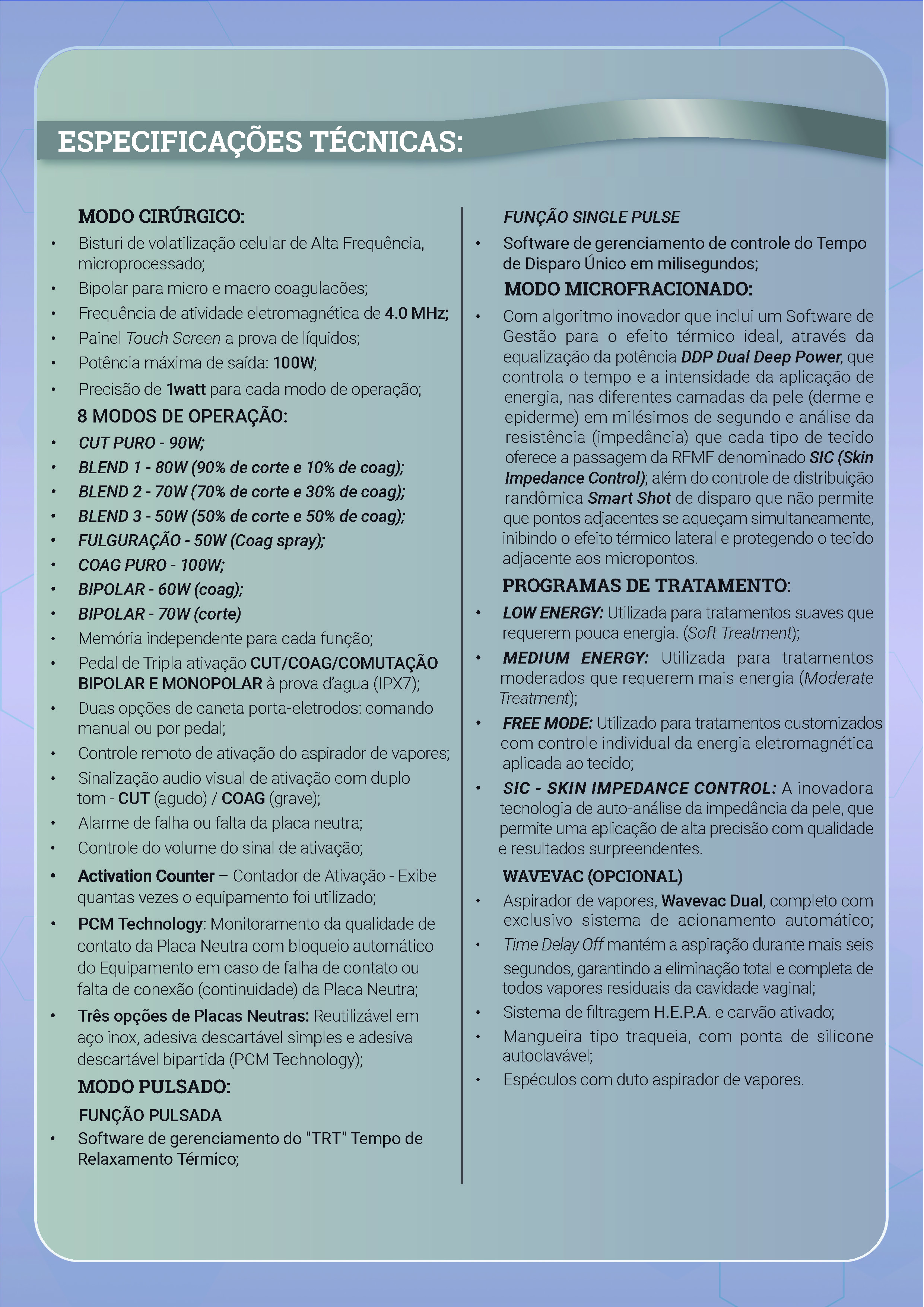 Sistema de filtragem H.E.P.A. e carvão ativado; Mangueira tipo traqueia, com ponta de silicone autoclavável;
